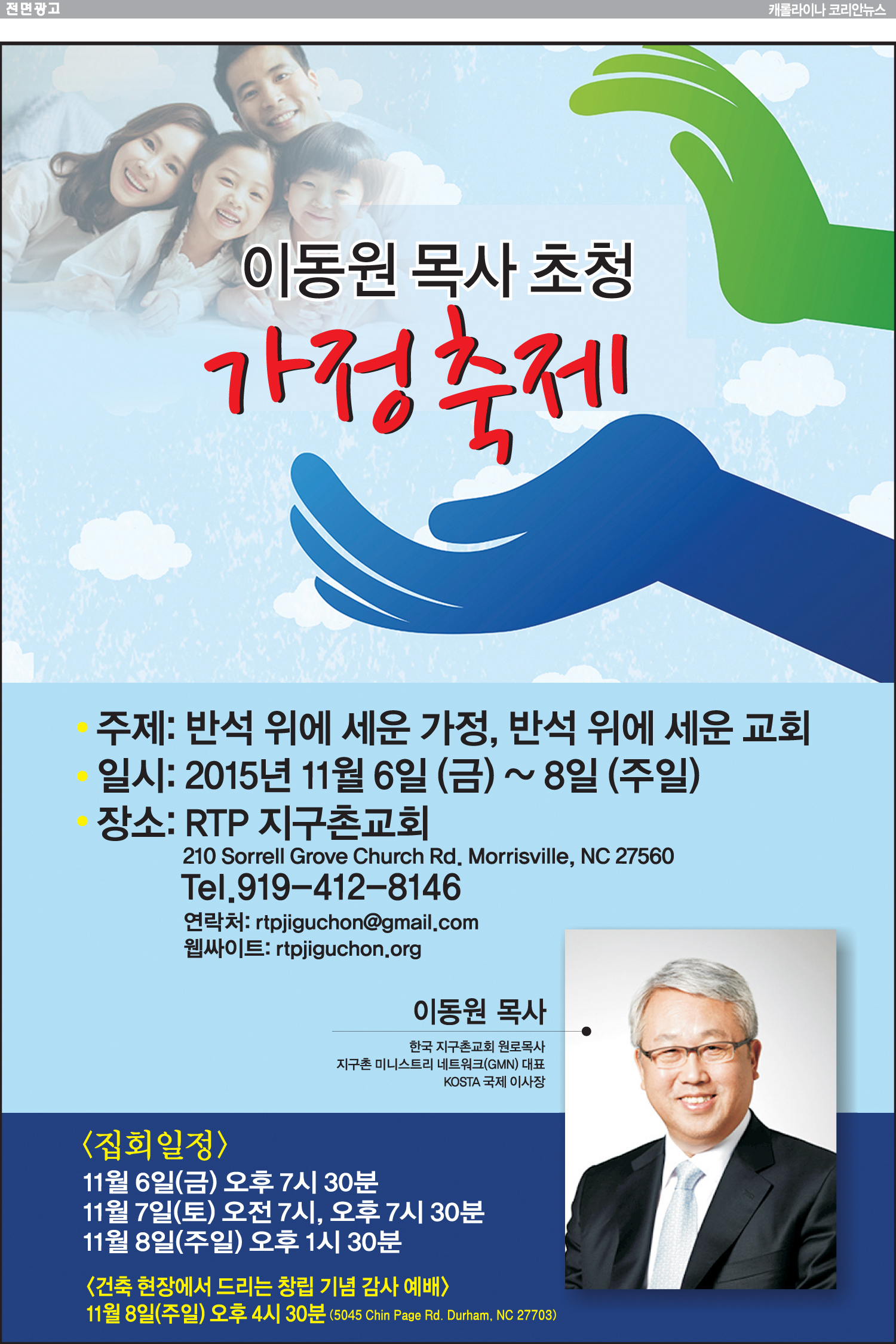 집회일정11월 6일 (금) 저녁 7시 30분11월 7일 (토) 아침 7시, 오후 7시 30분11월 8일 (주일) 오후 1시 30분, 건축현장에서 드리는 창립기념감사예배 11월 8일 (주일) 오후 4시 30분 (5045 Chin Page Rd. Durham NC 27703)